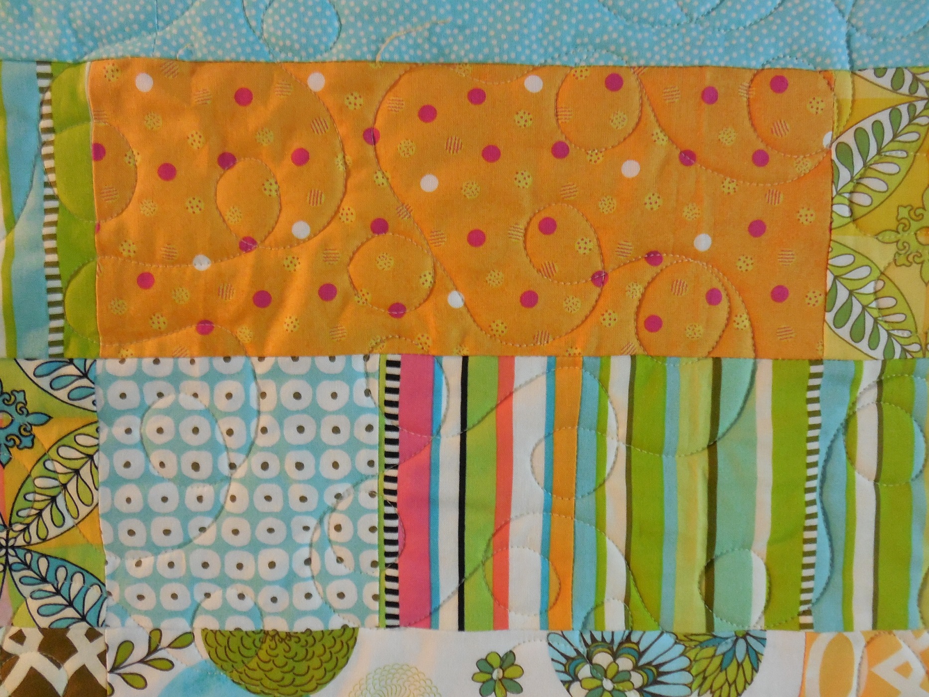5. Patterned Free Motion in Center, with Separate Borders: A combination of free-motion and custom quilting, taking some of the piecing into consideration.